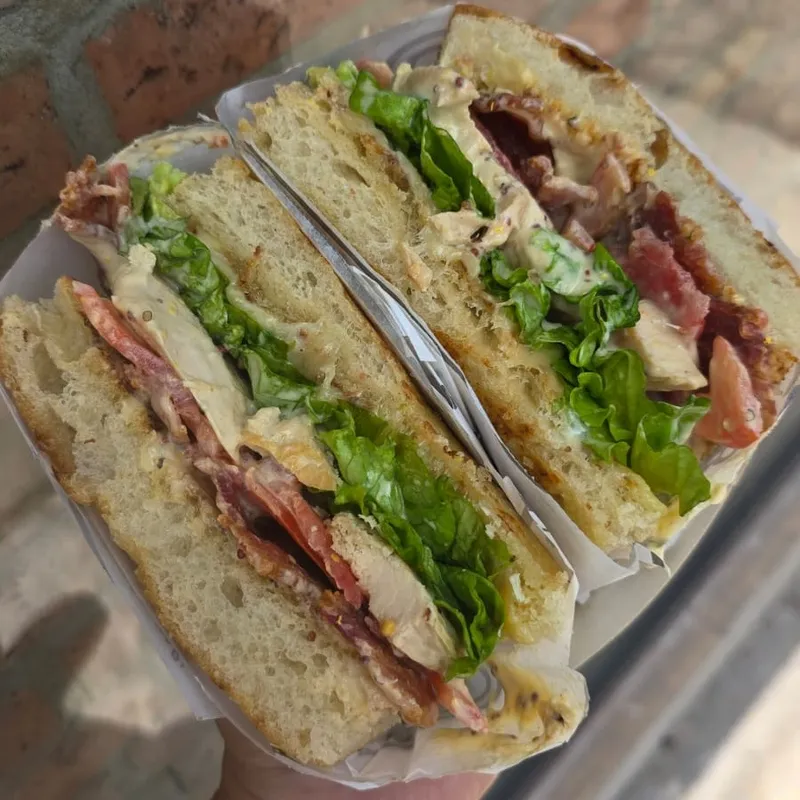 Jamón serrano, parmesano, tomates asados, rúcula, mayonesa albahaca, reducción de aceto balsámico, acompañado de papitas fritas Pan: Focaccia